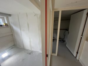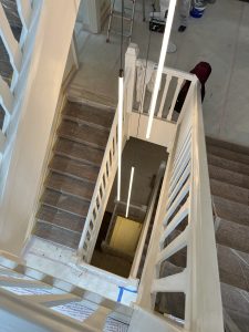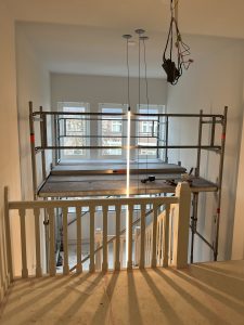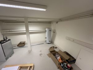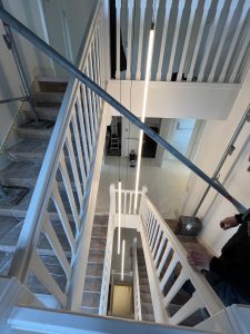 De verlichting in het trappenhuis is opgehangen en het resultaat is boven verwachting mooi! De kleine vergaderruimtes in het souterrain krijgen steeds meer vorm.