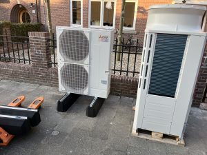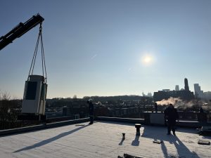 Vandaag zijn de bestaande luchtbehandelingskast en de 2 buitenunits van de nieuwe warmtepompen op het dak gehesen. Straks hebben we een hybride systeem dat standaard draait op de warmtepomp en de cv ketel kan bijstoken op piekmomenten. Dit alles wordt door middel van een Priva (regeltechniek) ingeregeld. De Priva gaat straks ook de zonwering op tijd schakelen.