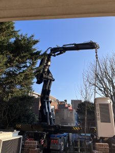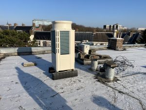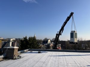 Vandaag zijn de bestaande luchtbehandelingskast en de 2 buitenunits van de nieuwe warmtepompen op het dak gehesen. Straks hebben we een hybride systeem dat standaard draait op de warmtepomp en de cv ketel kan bijstoken op piekmomenten. Dit alles wordt door middel van een Priva (regeltechniek) ingeregeld. De Priva gaat straks ook de zonwering op tijd schakelen.